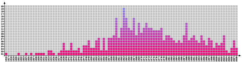| Antal tvåmetershoppare fördelat på födelseår (1916-2008) |