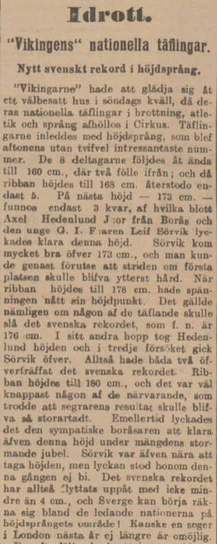 | 146 | 2.07 | Carl af Forselles | SoIK Hellas | 6 jan 2001 | Kuortane, FIN | 10 jun 2017 | 146 | 2.07 | Simon Larsson | IK Ymer | 15 jan 1998 | Söderhamn, SWE | 8 aug 2020 | 146 | 2.07 | i | Robin Jacobsson | Ullevi FK | 15 aug 1998 | Göteborg, SWE | 5 dec 2021 | 174 | 2.06 | Egon Nilsson | Ljungby IF | 7 aug 1926 | Nässjö, SWE | 11 sep 1960 | 174 | 2.06 | i | Henry Magnusson | IFK Göteborg | 10 jan 1952 | Göteborg, SWE | 20 maj 1971 | 174 | 2.06 | Leif Berndtsson | Heleneholms IF | 30 jun 1949 | Malmö, SWE | 16 jun 1972 | 174 | 2.06 | i | Kent Hansson Böe | Råby-Rekarne GoIF | 3 jan 1955 | Falun, SWE | 4 mar 1973 | 174 | 2.06 | Tomas Nysjö | IFK Umeå | 16 apr 1958 | Hudiksvall, SWE | 11 jun 1975 | 174 | 2.06 | Bertil Ljungqvist | Dingle IF | 31 okt 1953 | Varberg, SWE | 31 jul 1977 | 174 | 2.06 | Roland Karlsson | Valbo AIF | 10 feb 1959 | Sollefteå, SWE | 24 jul 1981 |